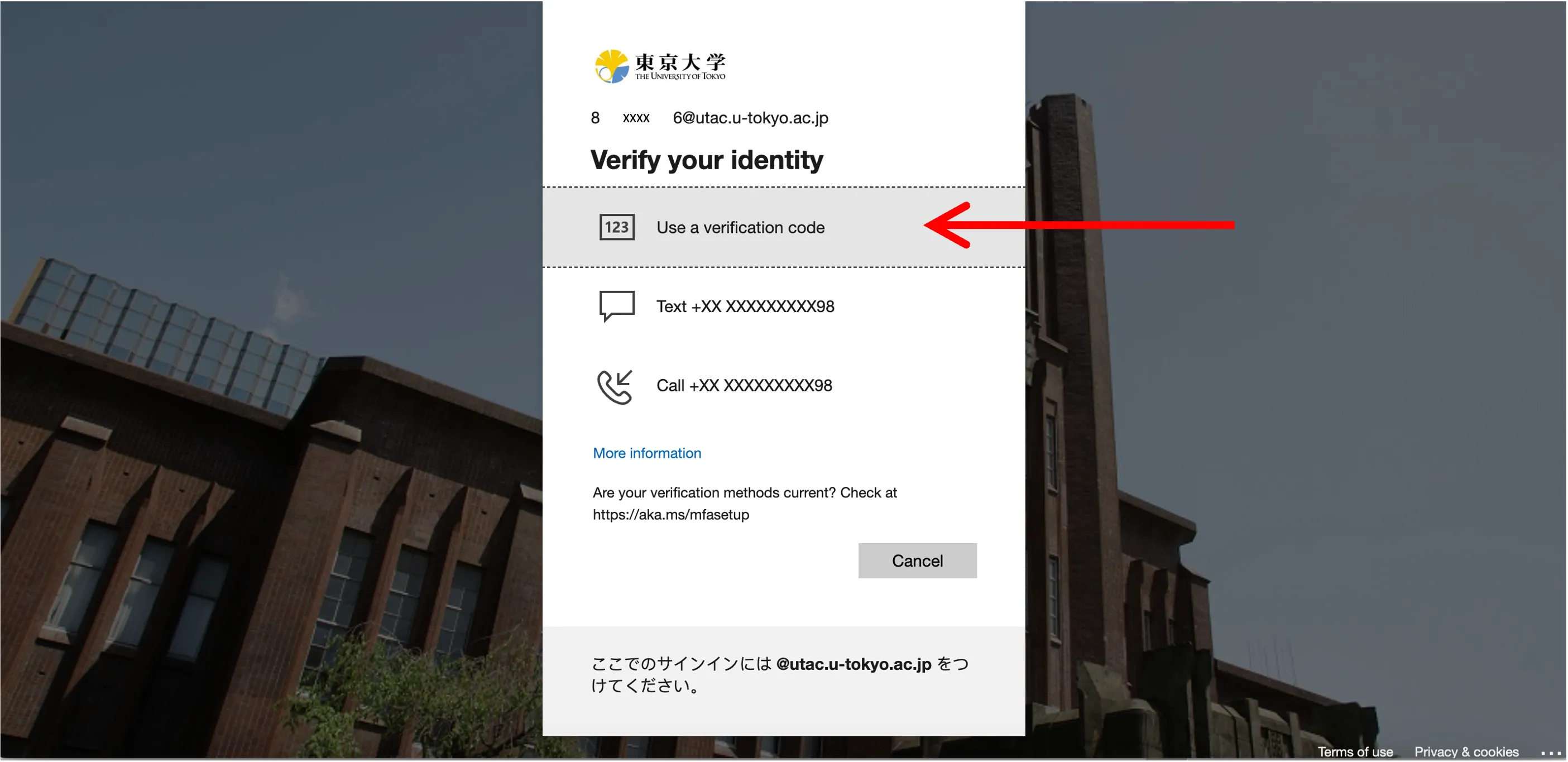 * If you have the default verification method set to “App-based authentication or hardware token - code”, the screen in step 3 will be displayed from the beginning. Please follow step 3 as steps 1 and 2 will be skipped.