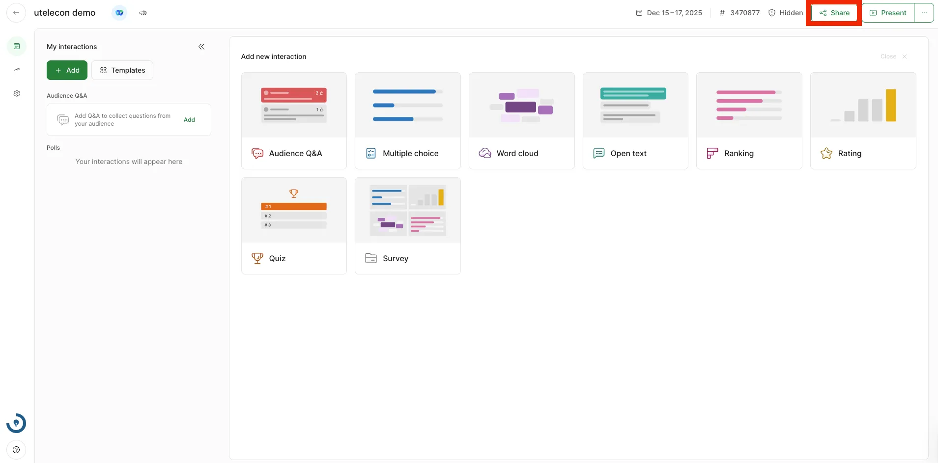 - 「Create slido」をクリックすると,イベントが作成されます.イベント画面右上の「Share」ボタンをクリックし,表示されたポップアップ内の「Copy joining link」ボタンを押すと,イベントに参加するための専用ページのURLがクリップボードにコピーされるので,このURLを参加者に共有してください.参加者はURLにアクセスすることで,イベントに参加できます.