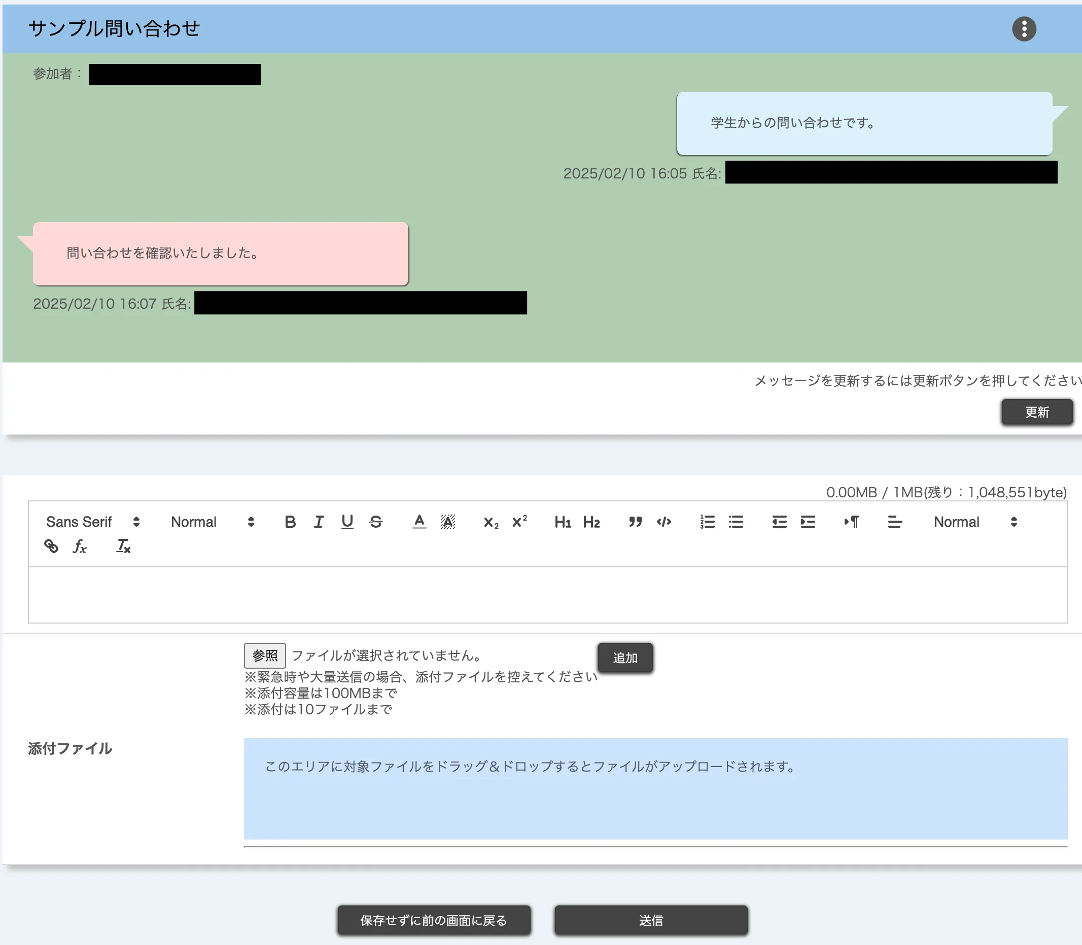2. メッセージに返信する場合は,本文と添付ファイルを入力して送信してください.