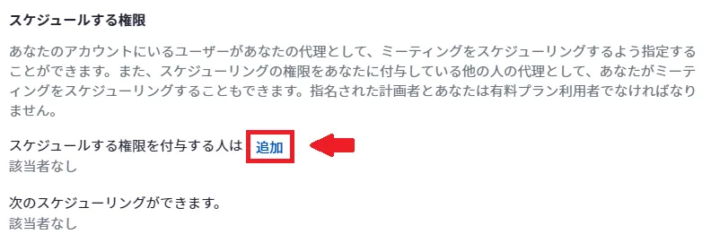 - 「ミーティング」タブを選択し,「その他」欄の「スケジュールする権限」まで移動し,[追加]を選択してください.